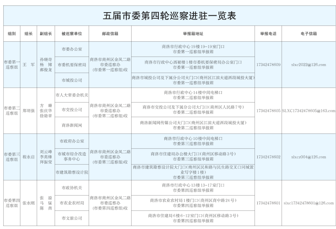據(jù)了解,市委4個巡察組將在被巡察單位工作50天左右,巡察期間設(shè)立專門舉報電話、舉報信箱,主要受理反映本輪12個被巡察單位領(lǐng)導(dǎo)班子及其成員、本單位其他市管領(lǐng)導(dǎo)干部、重點崗位黨員干部和下一級單位主要負(fù)責(zé)人的有關(guān)問題,重點是違反政治紀(jì)律、組織紀(jì)律、廉潔紀(jì)律、群眾紀(jì)律、工作紀(jì)律、生活紀(jì)律方面的舉報和反映。各巡察組受理來電時間為工作日8:00—18:00,受理信訪時間截止到2023年11月25日。